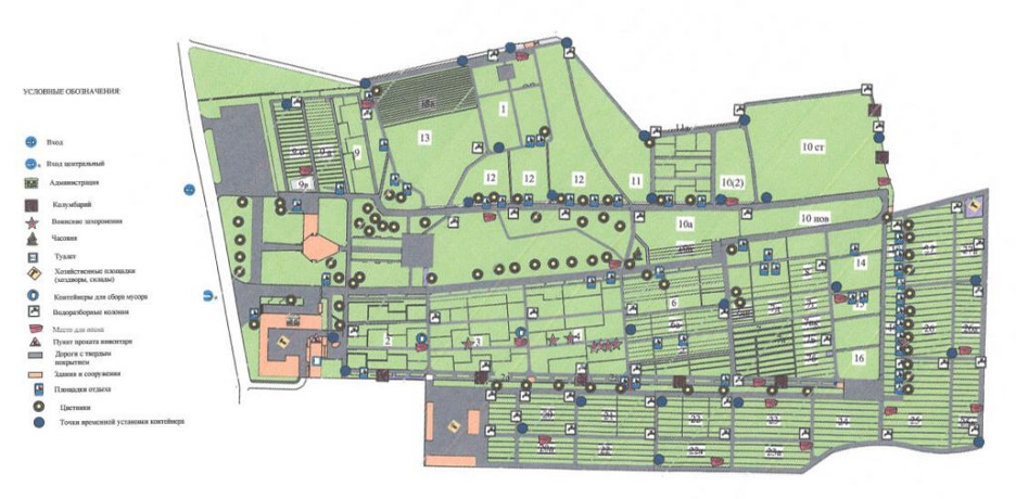 Все сектора на карте захоронений Троекуровского кладбища пронумерованы в белых прямоугольниках – по этой нумерации посетители и могут ориентироваться. Почетные братские и воинские захоронения выделены красной звездой, а гражданские окрашены в зеленый. Синими пунсонами с белой точкой в центре указаны контейнеры для сбора мусора, значками с краном – водозаборные колонки.